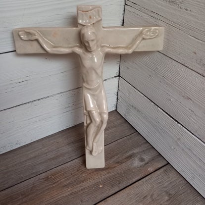 Meestal op een houten kruis, maar deze is geheel van keramiek. Creme wit en geglazuurd, dateert van ongeveer 1900.