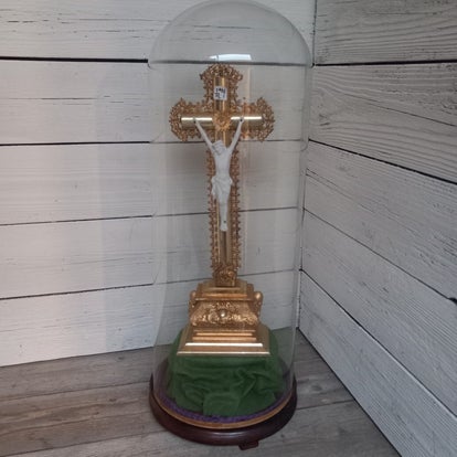 Prachtige vergulde crucifix mooi gedetaileerd. Hij staat op een kleine gestoffeerde verhoging op een houten voet. De glazen stolp is ook zonder gebreken.