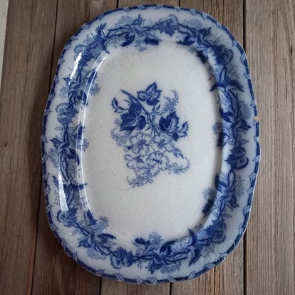Flow Blue is een stijl van blauw-wit aardewerk die zijn oorsprong vond in Engeland in de jaren 1820. De naam is afgeleid van het blauwe glazuur dat tijdens het bakken vervaagde of 'vloeide', wat zorgde voor een wazig, diffuus effect. Soortgelijke serviezen zijn ook geproduceerd door andere makers, zoals W. H. Grindley & Co. en Wedgwood. Aan de rand is een kleine beschadiging (zie laatste foto).