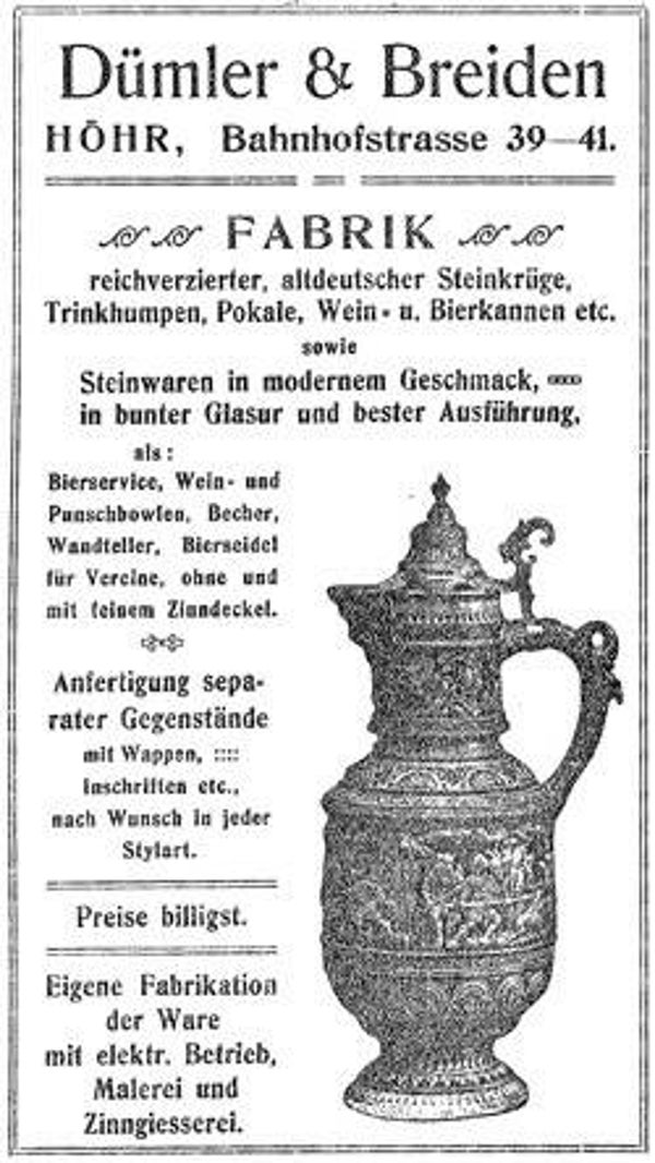 De fabriek startte haar produktie in 1883 en was gevestigd in Höhr-Grenzhausen, een plaats die bekend werd vanwege de vele keramiekfabrieken. De oprichters waren Peter Dümler (7/11/1860 - 19/04/1907) en zijn zwager Albert Breiden (12/06/1860 - 27/05/1926).