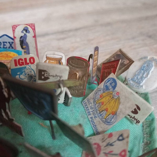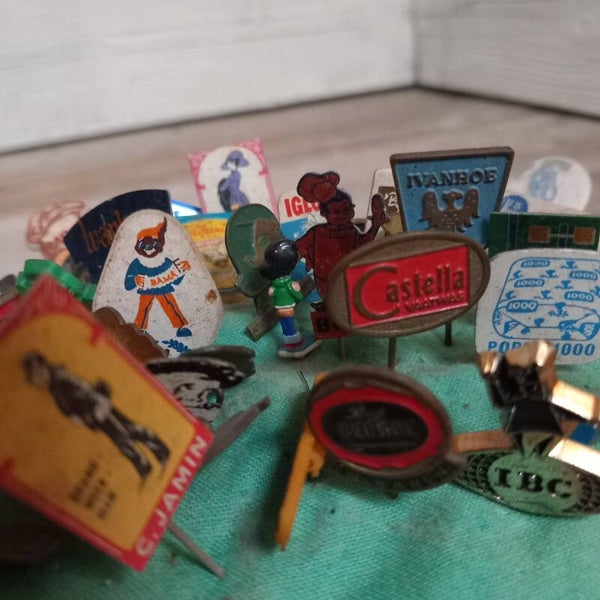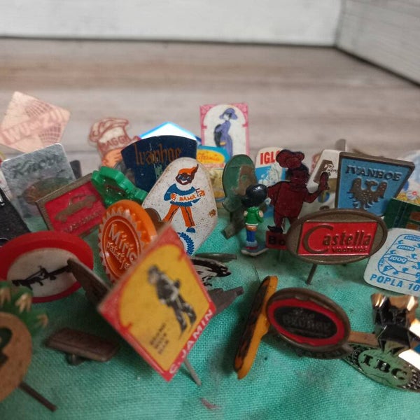 Speldenkussen met reclamespeldjes.