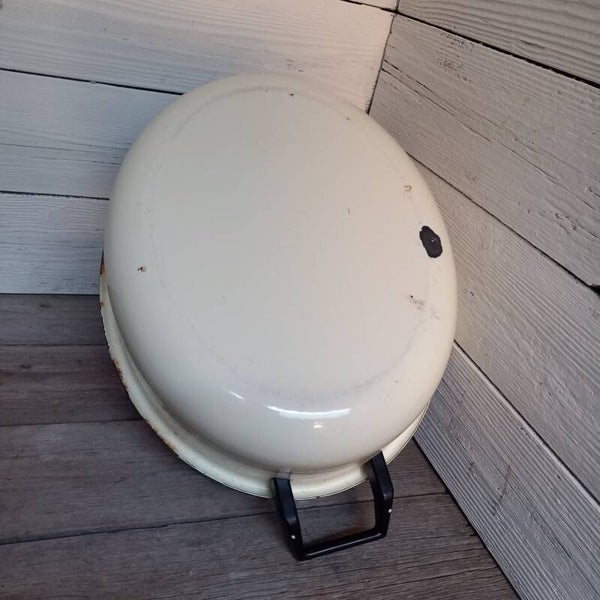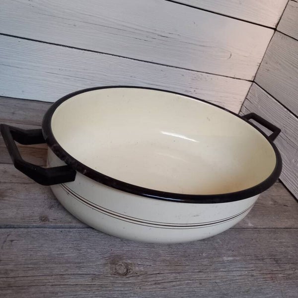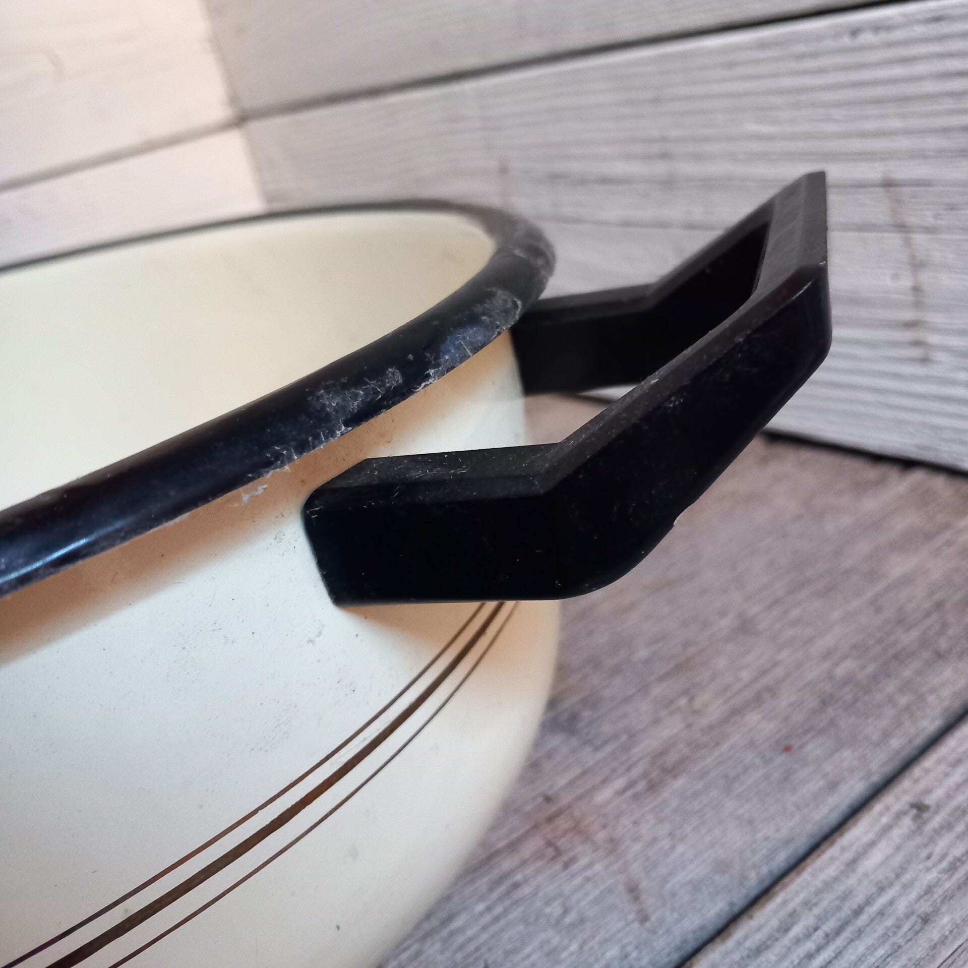 Creme wit met zwarte handvaten, zwart randje bovenop en goudkleurige decoratieve streepjes op de zijkanten.