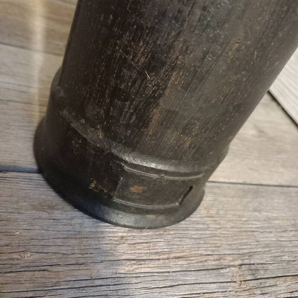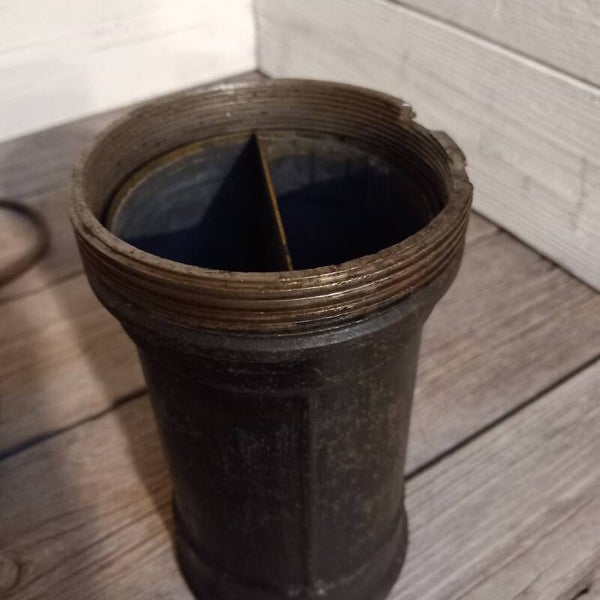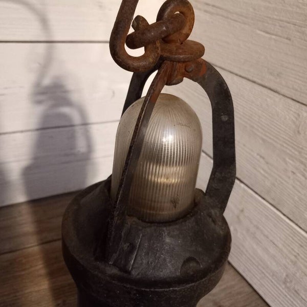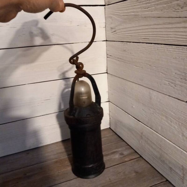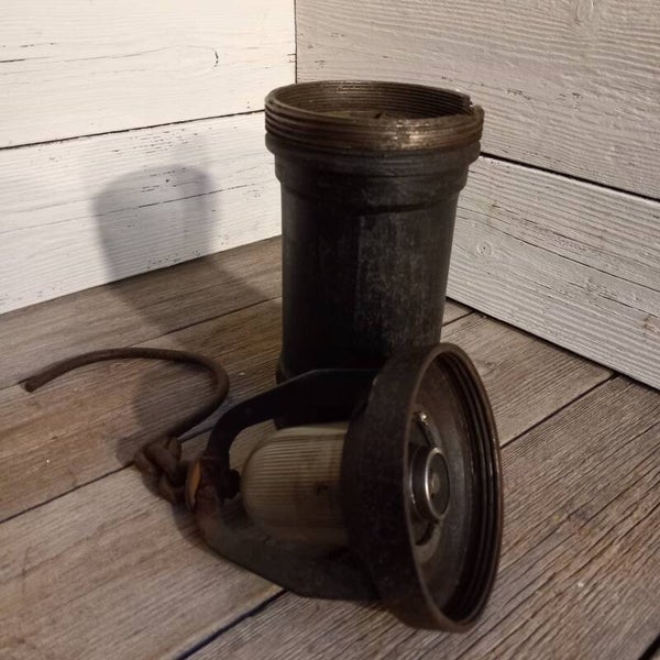 Deze zware lamp werd uitsluitend gebruikt als lichtbron, en werkte op een accu. Hij is nog prima afschroefbaar, en de zware metalen haak is ook nog aanwezig.
