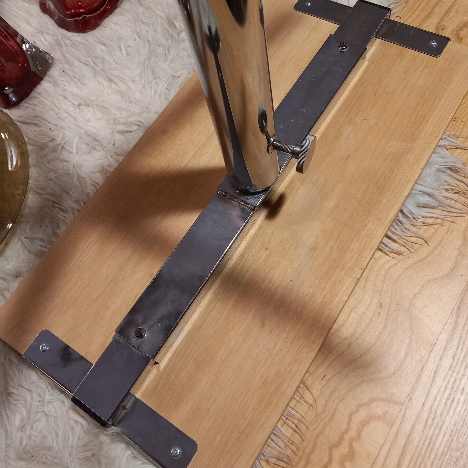 Vintage salontafel, met verchroomd onderstel, in hoogte verstelbaar.
