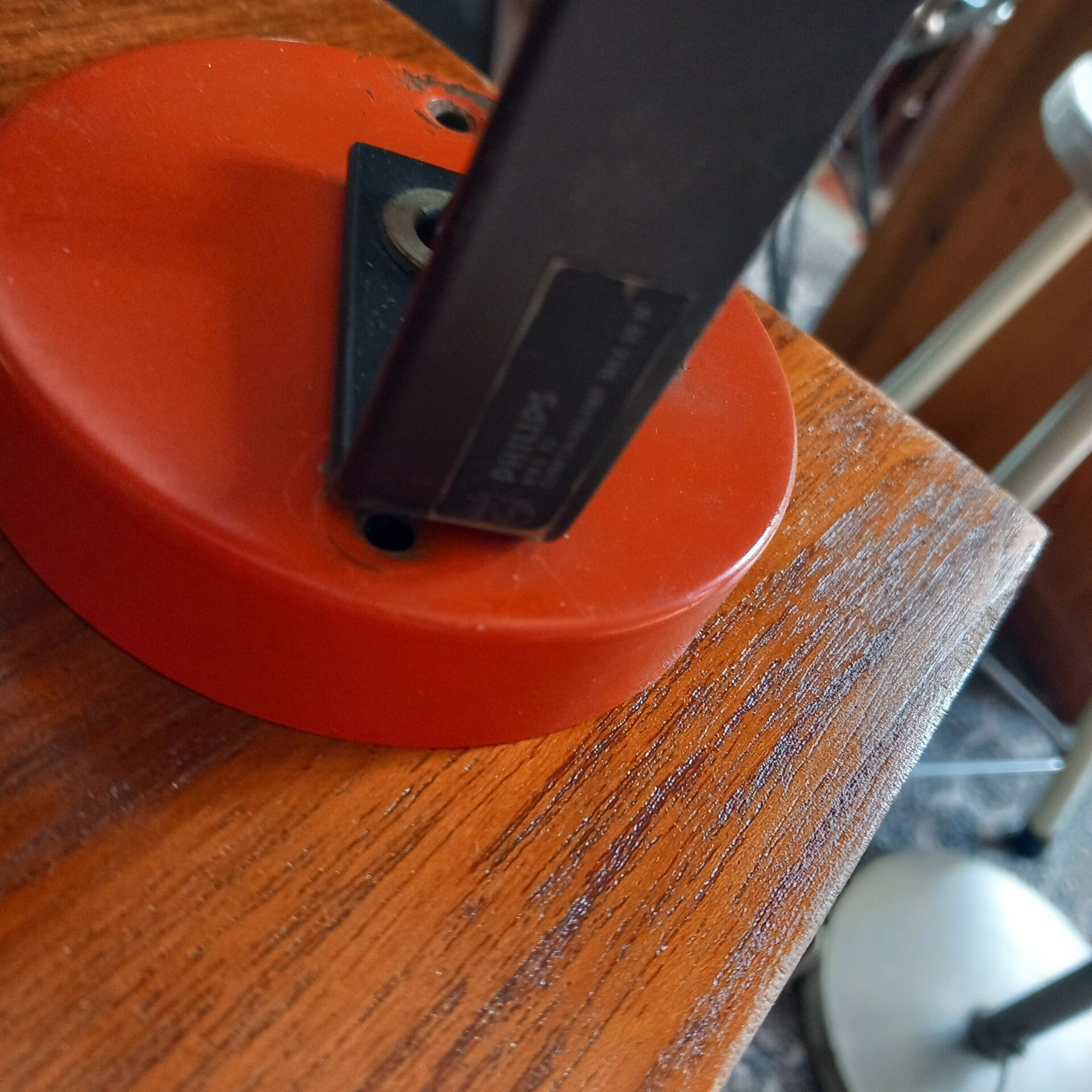 Kenmerkende kleuren heeft dit spotje. Handig niet te groot lampje, is ook aan de wand te bevestigen, met gebruikssporen.