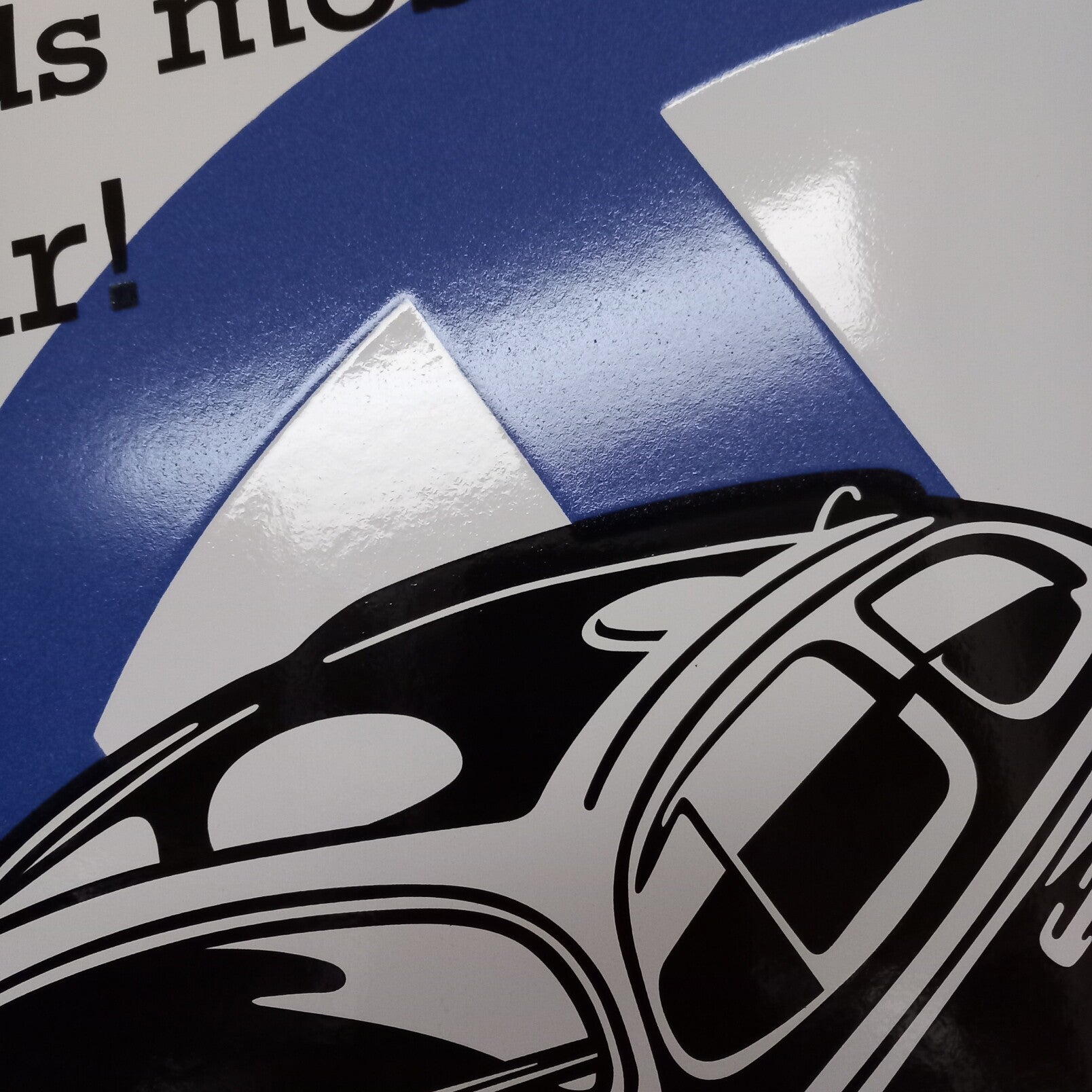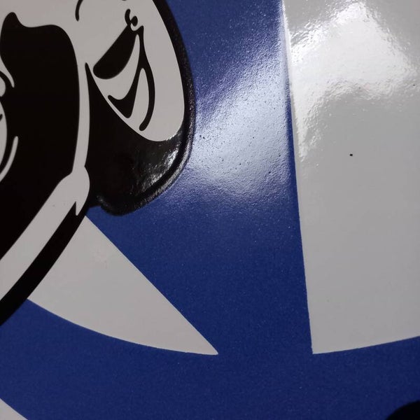 Een prachtig groot emaille bord. Gemaakt van 1,2 mm dik staal met prachtige heldere kleuren. Het bord heeft vier gaten voor de bevestiging. Mooi dik opgezette kleuren, bij bepaalde lichtinval geeft dit een mooi relief.
