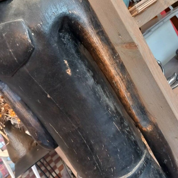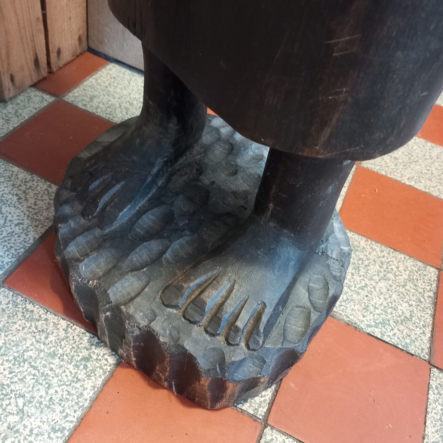 Prachtig imposant massief houten Afrikaans mannelijk figuur, mooi gedecoreerd met houten kralenkettingen. Ondanks zijn hoogte van 125 cm nemt dit beeld niet veel plaats in omdat ie smal is. Zet deze in je interieur of mancave, en hij maakt direct indruk.