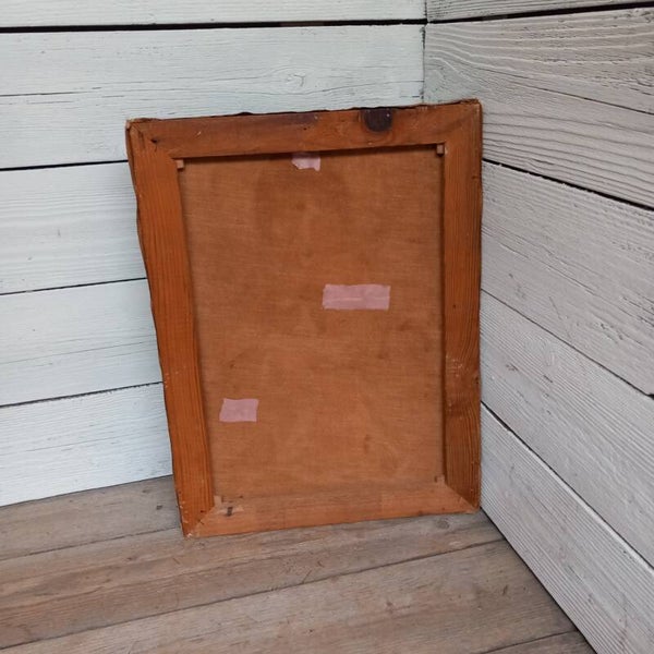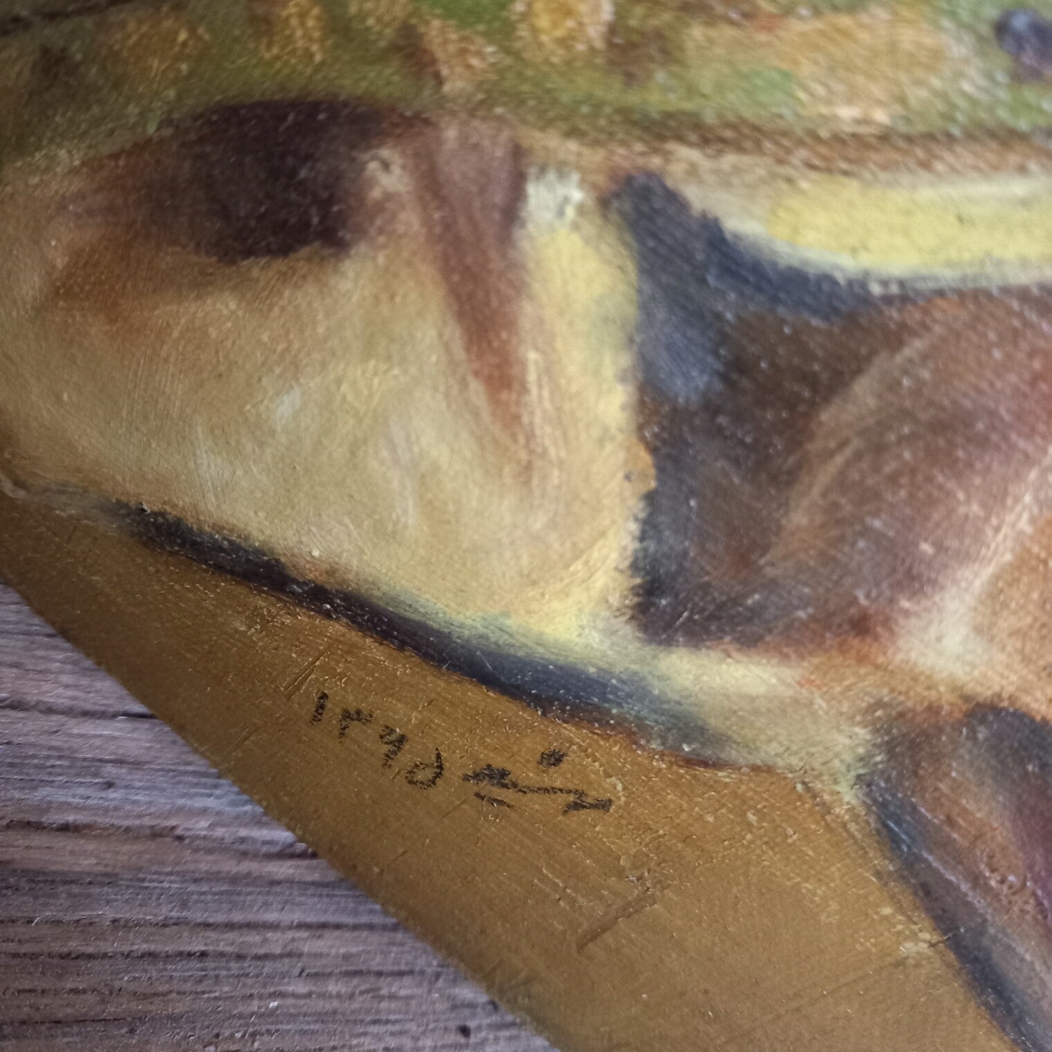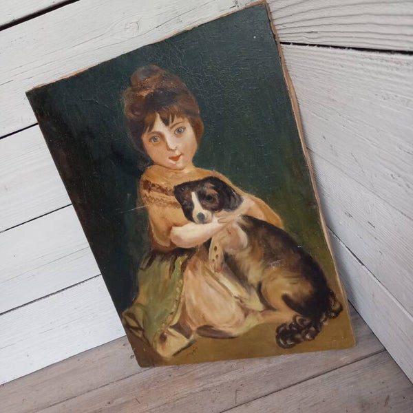 Ik ben bij dit schilderij gevallen voor het lieflijk tafereel. Het schilderij heeft al een heel leven achter zich en is wel gesigneerd.