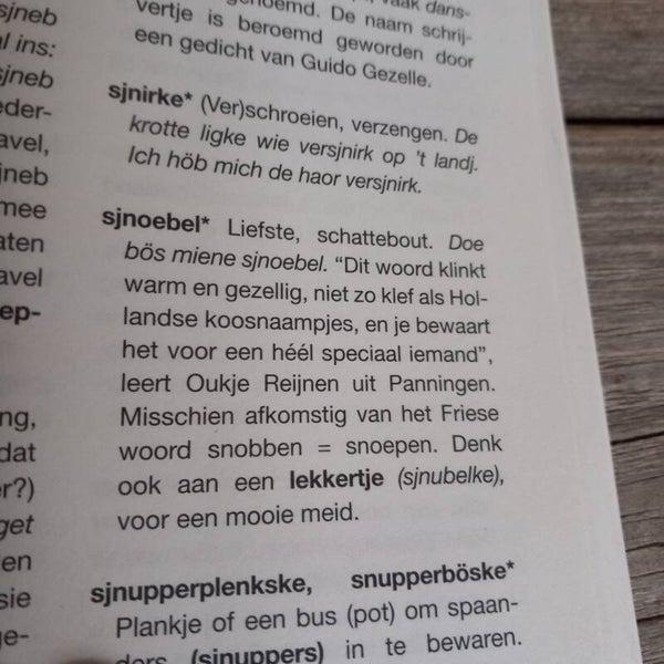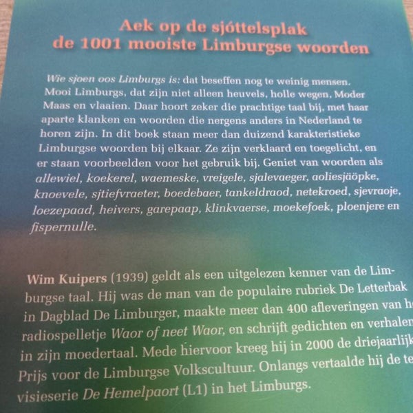 Wie sjoen oos Limburgs is: dat beseffen nog te weinig mensen. Mooi Limburgs, dat zijn niet alleen heuvels, holle wegen, Moder Maas en vlaaien. Daar hoort zeker die prachtige taal bij, met haar aparte klanken en woorden die nergens anders in Nederland te horen zijn. In dit boek staan meer dan duizend karakteristieke Limburgse woorden bij elkaar. Ze zijn verklaard en toegelicht, en er staan voorbeelden voor het gebruik bij. Geniet van woorden als allewiel, koekerel, waemeske, vreigele, sjalevaeger, aoliesjäöpke, knoevele, sjtiefvraeter, boedebaer, tankeldraod, netekroed, sjevraoje, loezepaad, heivers, garepaap, klinkvaerse, moekefoek, ploenjere en fispernulle.