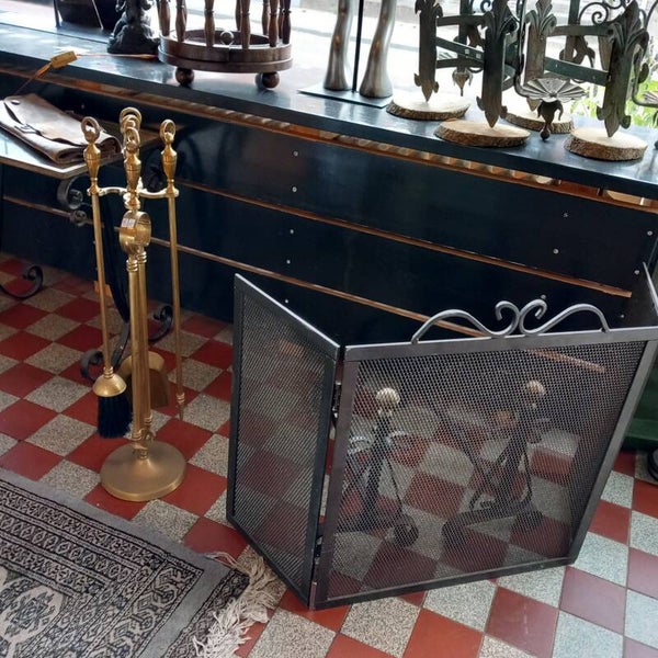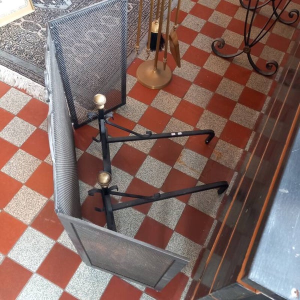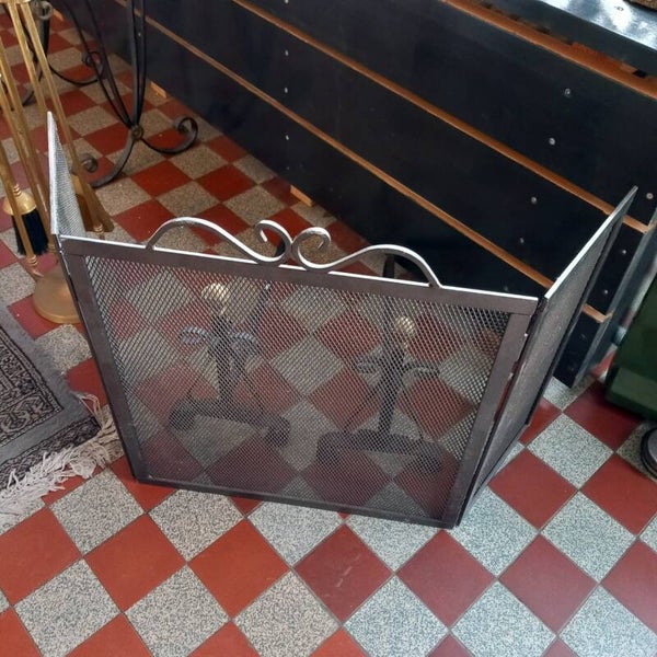 Stevig metalen haardscherm om voor uw haard te plaatsen. Hierbij afgebeeld staan ook nog twee haardbokken, om in de haard te plaatsen. En ernaast dan nog een een messing haardstel met de bekende 4 hulpmiddelen. Haardbokken en haardstel zijn elders op de webshop te koop.