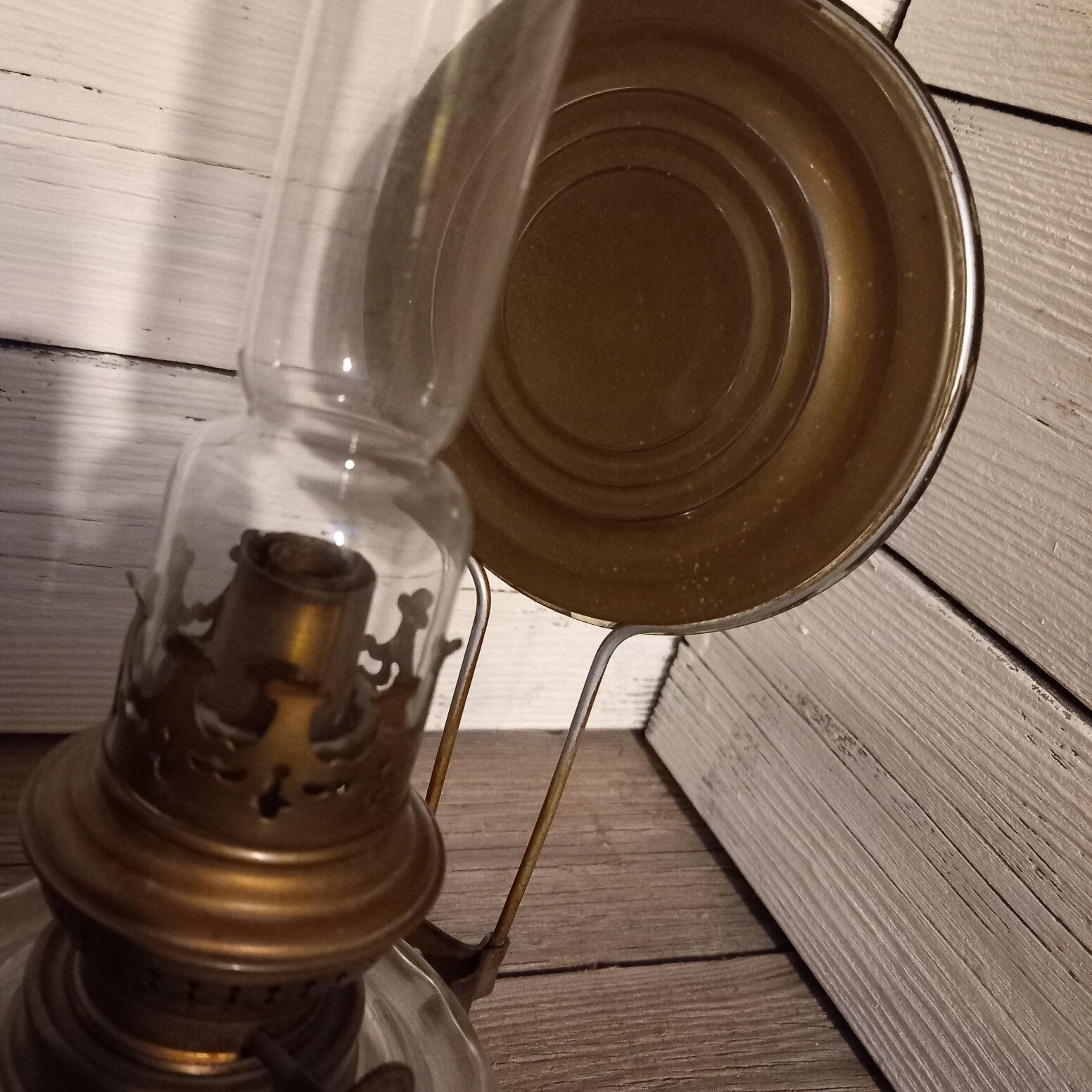 Middels het haakje kan deze lamp tegen de wand worden gehangen. Het koperen achterwandje reflecteerd het licht. Hij is te vullen met lampenolie, en eventueel nog te gebruiken.