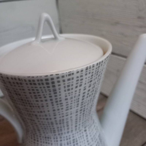 Het patroon op de koffiepot wordt "Seidenbast" genoemd, wat verwijst naar het fijne, geweven ogende decor.