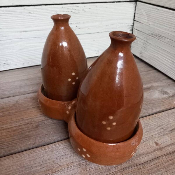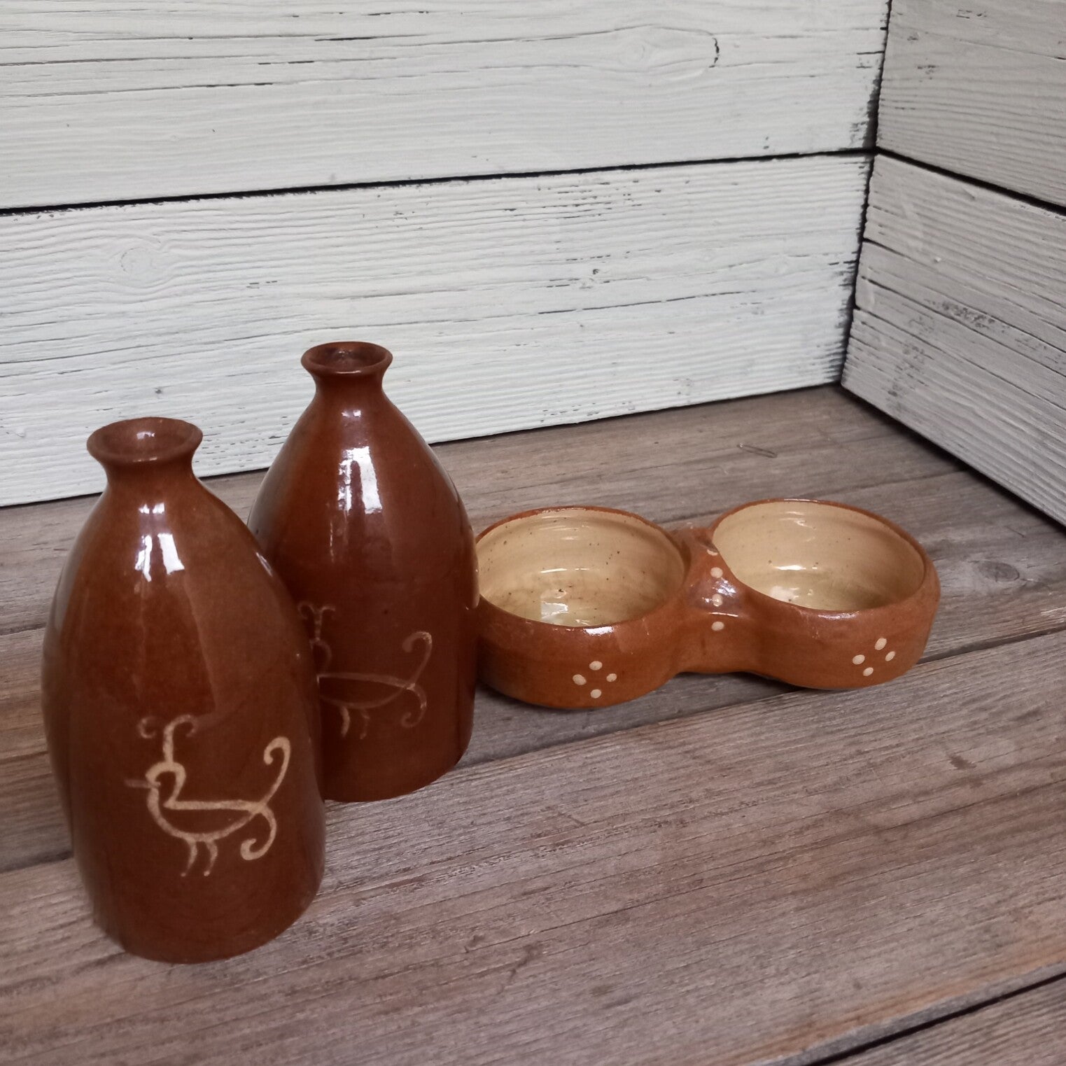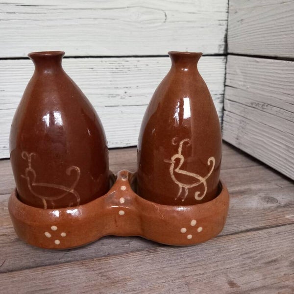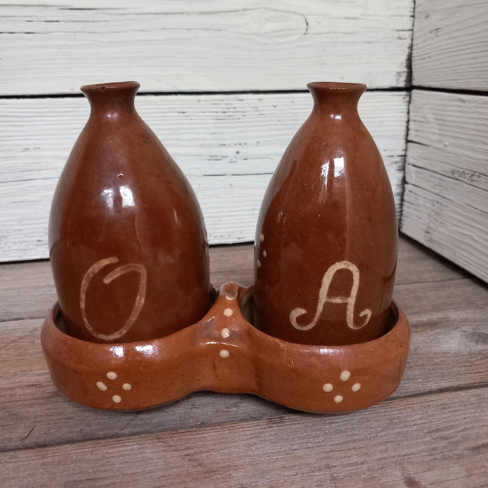 Handig en leuk op tafel dit vintage setje. Waarschijnlijk Italiaans, a voor "aceto" en o voor "olio".