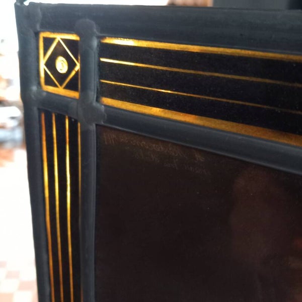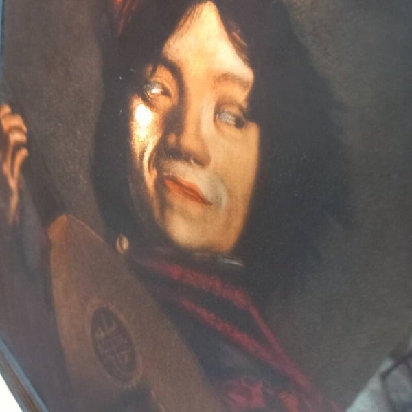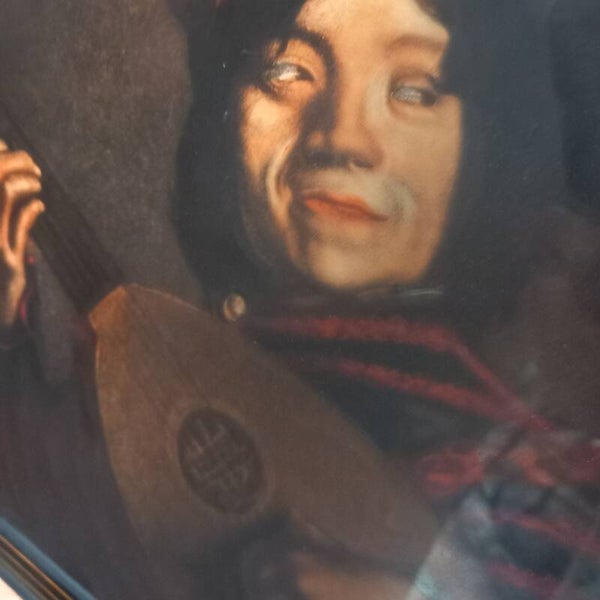 "De luitspeler" van Frans Hals op gebrandschilderd glas in lood.