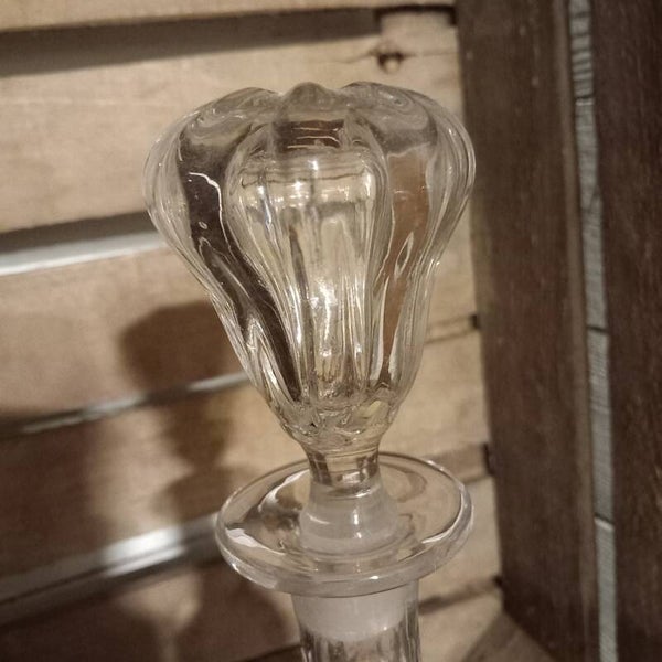 Dit is een Victoriaanse klokvormige pilaarkaraf, ook bekend als een Newcastle-karaf. Deze karaf is gemaakt van helder loodkristal en dateert uit de periode van 1850-1899. Het klokvormige ontwerp en de pilaren aan de zijkanten zijn kenmerkend voor de stijl.