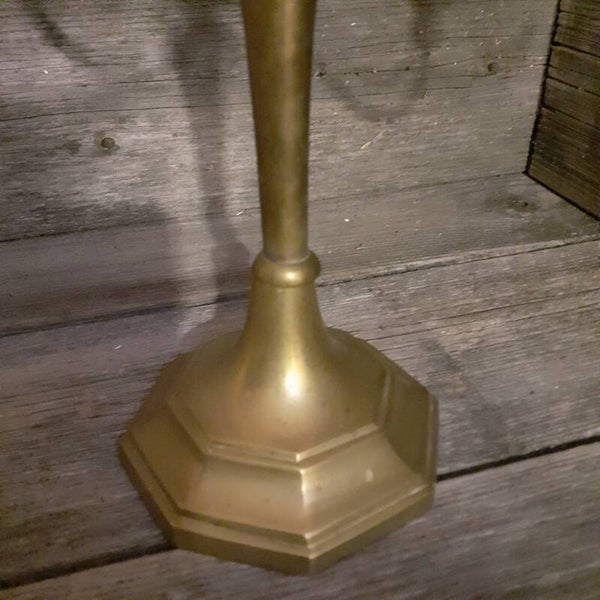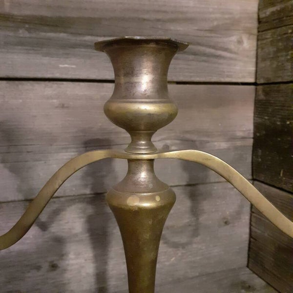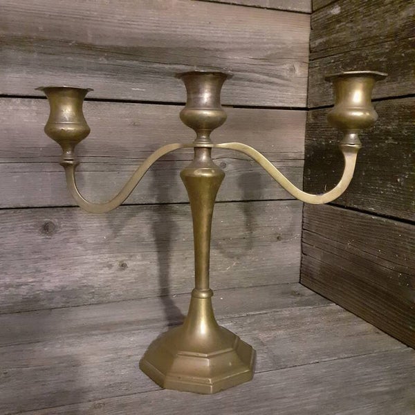 Accessoires: Gave 3 armige kandelaar van messing, hoogte 24 cm.